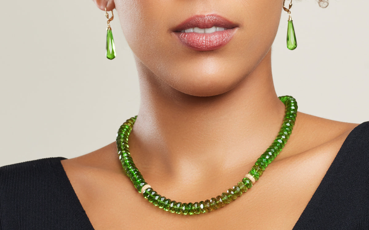 Ein geheimnisvolles Paradies aus grünen Edelsteinen. Jedes Schmuckstück dieser Kollektion verbindet die frische Eleganz des Peridots, die zeitlose Schönheit des Smaragds, die warme Anmutung des grünen Bernsteins und die lebhaften Farben des Turmalins. Tauchen Sie ein in eine Welt, in der Natur und Eleganz Hand in Hand gehen. Diese Schätze werden Sie in ein privates Paradies entführen, das nur für Sie bestimmt ist.